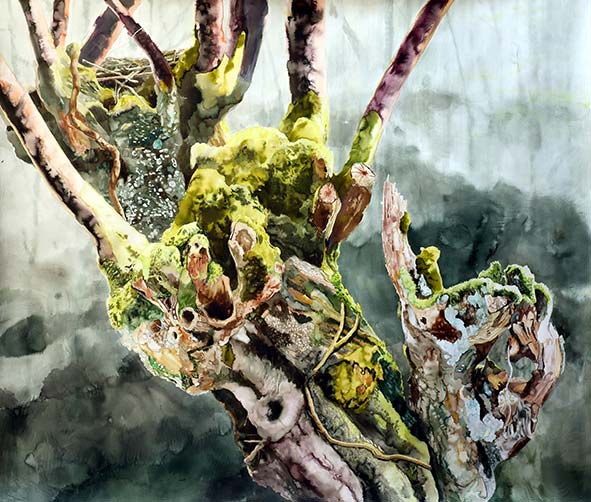 Tanya Poole (*1971 in Kanada) untersucht in Malerei und Zeichnung die Verbindungen zwischen Mensch, Natur und Wissenschaft. Ihre Arbeiten entstehen aus einer intensiven Beobachtung der Menschen, Tiere und Landschaften in ihrer Umgebung. Dabei interessiert sie besonders das Dazwischen – jene Bereiche, in denen wissenschaftliche Erkenntnis, Naturbeobachtung und persönliche Erfahrung ineinandergreifen. Ihre großformatigen Tuschezeichnungen verbinden Präzision mit einer stillen, poetischen Bildsprache. Das Kunstmuseum im Marstall zeigt mit „The Eyes and the Guide“ Arbeiten aus verschiedenen Werkserien. Erstmals zu sehen ist die neue Serie „Tetard“, die sich mit der Symbiose von Pflanzen in der Umgebung ihres aktuellen Wohnortes in Frankreich beschäftigt. Im Fokus stehen sogenannte Kopfbäume wie Weiden, auf denen sich komplexe Strukturen aus Flechten und Moosen entwickeln. Die Arbeiten machen Kreisläufe von Werden und Vergehen sichtbar und richten den Blick auf die Vielfalt des Lebens im kleinsten Raum.